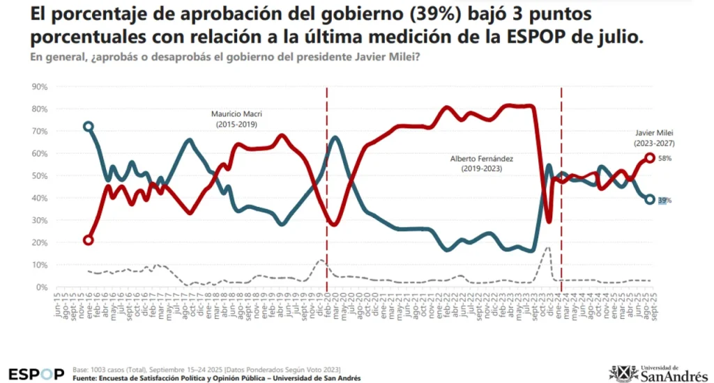 La aprobación al gobierno de Javier Milei se sostiene en un frágil 39 %, con un rechazoque trepa al 58 %, tres puntos más que en julio, el nivel más bajo desde que asumió.Con datos ya ponderados según el voto de 2023 y un margen de error de ±3,15puntos, esta tendencia decreciente se replica en otros sondeos.