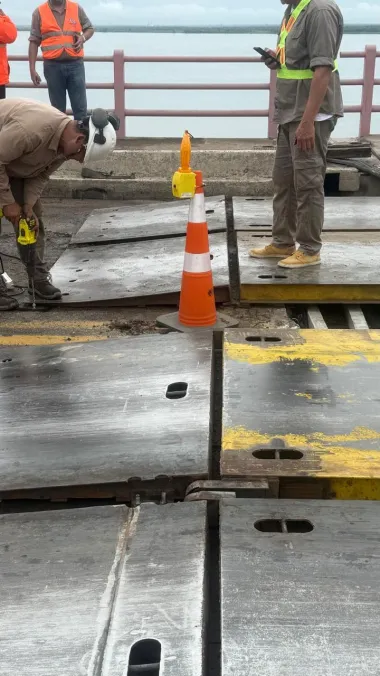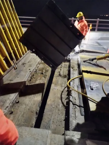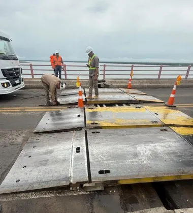 El trabajo que lleva adelante Vialidad Nacional, implica el cambio de tres juntas tipo Transflex originales de la estructura. Las juntas armadas son módulos de neopreno y acero de 1,10 por 1,00 metro con un peso aproximado de 300 kilogramos cada una.