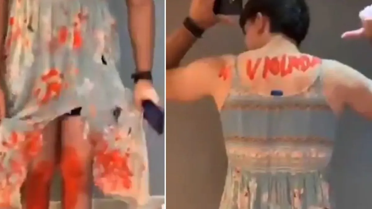 En las imágenes que circularon en redes se lo puede ver con un vestido desgarrado, el cuerpo pintado con manchas rojas que simulaban sangre y la palabra “violada” escrita en la espalda. La secuencia fue grabada por sus compañeros y publicada en la cuenta oficial de Instagram de la promoción, desde donde se viralizó en cuestión de horas.