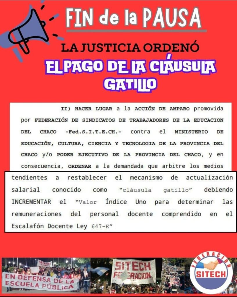 Finalmente, indicó que el fallo judicial establece que “la provincia tiene un plazo de 60 días para cumplir con el pago de la cláusula gatillo”, tanto la correspondiente al segundo trimestre, impaga desde julio, como la del tercero, que debe abonarse con los sueldos de octubre. “Esperamos que el Gobierno cumpla con la justicia y con su palabra. Este derecho alcanza también a los jubilados, porque los aumentos son en blanco y repercuten en todos los haberes”, concluyó.