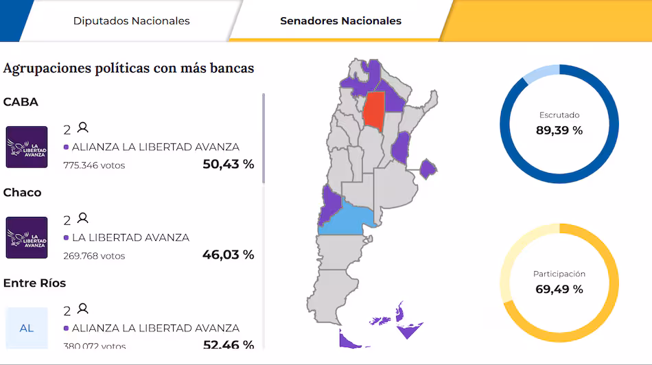 Con 90,88% de las mesas escrutadas, las elecciones legislativas 2025 tuvieron como ganador a La Libertad Avanza a nivel país con un 40,84% en la votación, seguido de Fuerza Patria con 24,50%, seguido por Provincias Unidas (5,1%) y el Frente de Izquierda (3,7%).