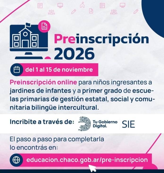 Según la información oficial, desde este sábado 1 y hasta el 15 de noviembre estará habilitada la preinscripción online para niños que ingresen a jardines de infantes y a primer grado de escuelas primarias de gestión estatal, social y comunitaria bilingüe intercultural del Chaco.