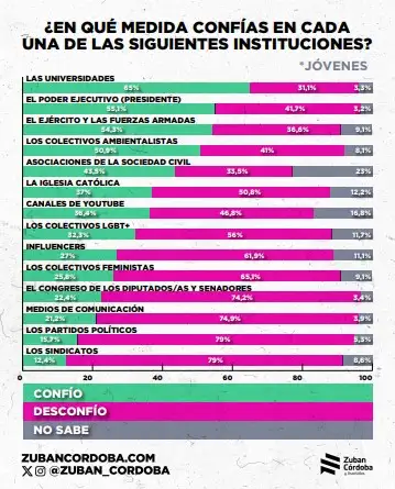 Las instituciones tradicionales concentran los valores más altos de rechazo. El Congreso reúne un 74,2% de desconfianza y un 22,4% de confianza. Los medios de comunicación, un 74,9% de desconfianza y un 21,2% de confianza. Los partidos políticos apenas alcanzan un 15,7% de confianza, frente a un 79% de desconfianza. Por último, los sindicatos registran un 79% de desconfianza, 12,4% de confianza y 8,6% de indefinición.