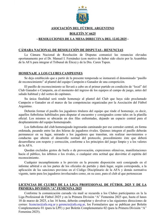 A su vez, se subraya que “cualquier incumplimiento a lo previsto en la presente disposición será consignado en el informe arbitral o en los partes oficiales del partido y dará lugar, según corresponda, a la aplicación de las sanciones previstas según el Código Disciplinario de la AFA y demás normativa vigente”.