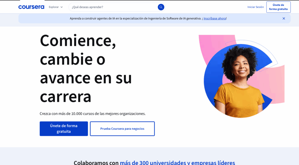 Uno de los referentes mundiales en educación online. Ofrece cursos de universidades y empresas líderes como Stanford, Google o Meta, muchos de ellos con acceso gratuito en su modalidad de auditoría.