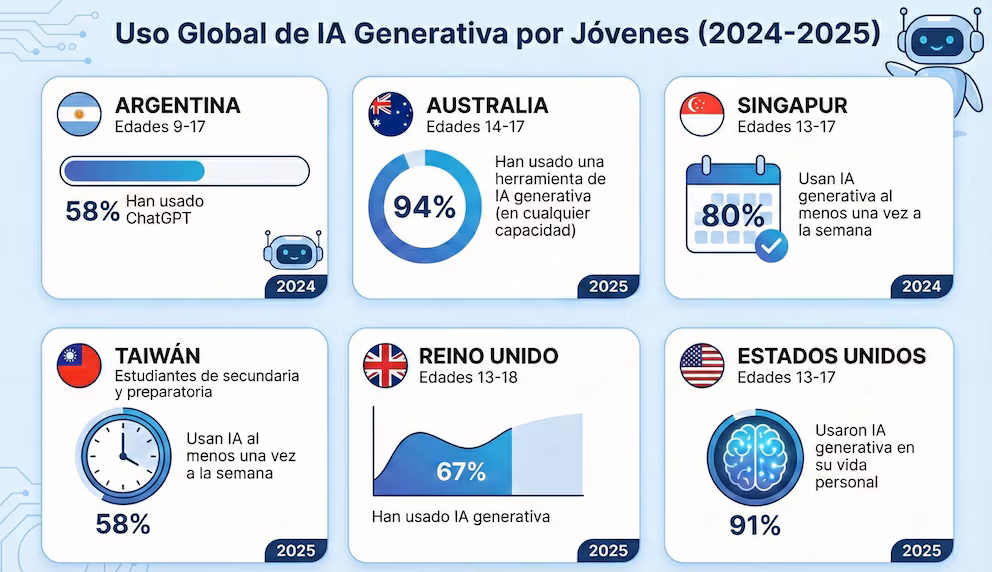 El nivel de acceso y uso de la IA difiere según la infraestructura y el entorno social de cada país. Datos citados por el estudio muestran que el 95% de los estudiantes de secundaria (edades 13-19) en Corea del Sur ha usado ChatGPT y el 91% en Estados Unidos (edades 13-17) utilizó IA generativa en su vida personal.