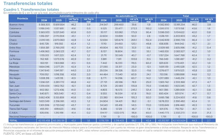 Según el último informe trimestral publicado por la Oficina de Presupuesto del Congreso (OPC), basado en el Sistema Integrado de Información Financiera (e-SIDIF), las transferencias totales a gobiernos provinciales y municipales aumentaron 44,3 % interanual en valores nominales, lo que representa un 2,7% de aumento en términos reales si se ajusta por inflación.