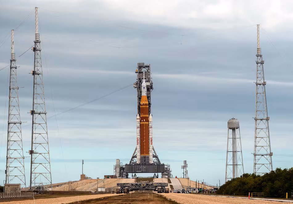 El cohete Space Launch System (SLS), que la NASA ya tiene preparado en la plataforma de lanzamiento de Cabo Cañaveral (Florida), no pasa desapercibido. Con más de 98 metros de altura, su imponente silueta se distingue a la distancia y también por su inconfundible color naranja.