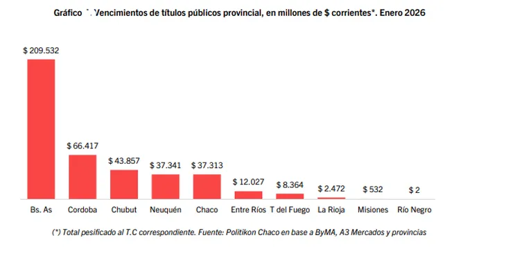 De acuerdo con el reporte privado durante enero los vencimientos de títulos públicos provinciales alcanzaron un total de $417.856 millones, con una variación del 0,5% interanual en términos reales y -60,1% respecto al mes previo .